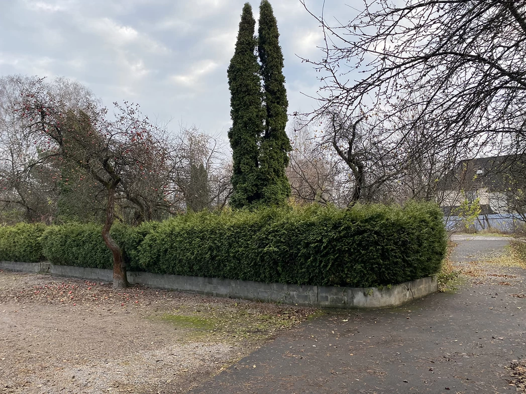 Помимо того, что участок находится у воды, он окружен лесом. Это позволяет компенсировать шлейф городского воздуха. На самом участке высоченные сосны, кипарисы, туи, яблони, березы. И частный причал.