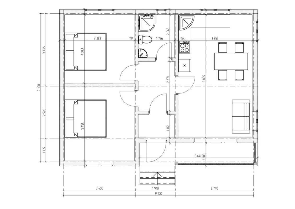 Каркасный дом 60 кв. м. Планировка включает две спальни, санузл, террасу.