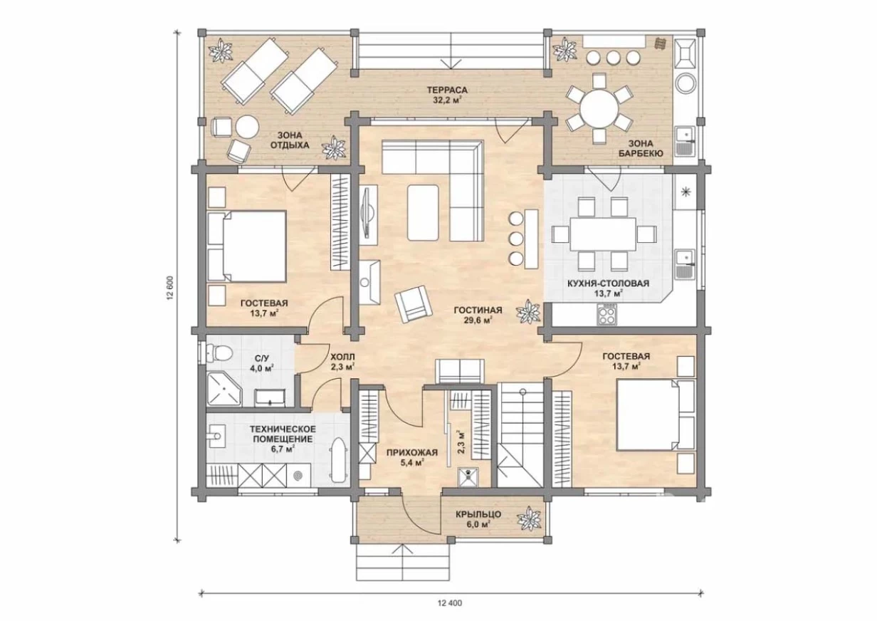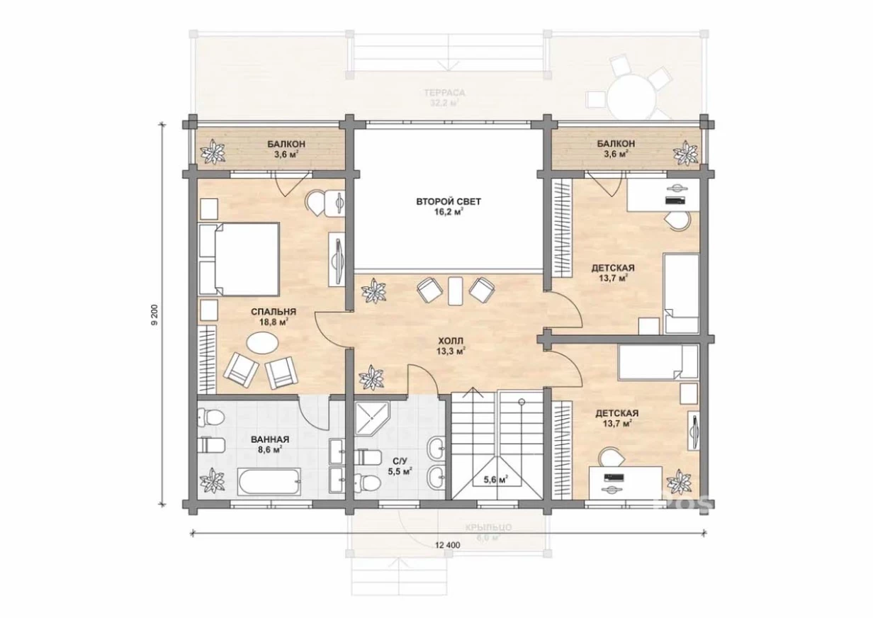 Двухэтажный дом из клееного бруса 232 кв. м. Планировка включает 5 спален, 2 санузла, просторную гостиную и кухню-столовую, террасу, техническое помещение для размещения инженерного оборудования, 2 балкона, на которые можно выйти из спален на втором этаже.