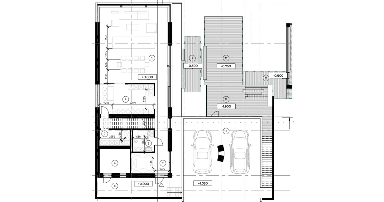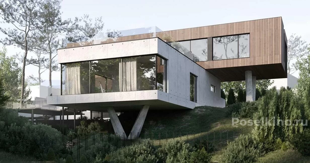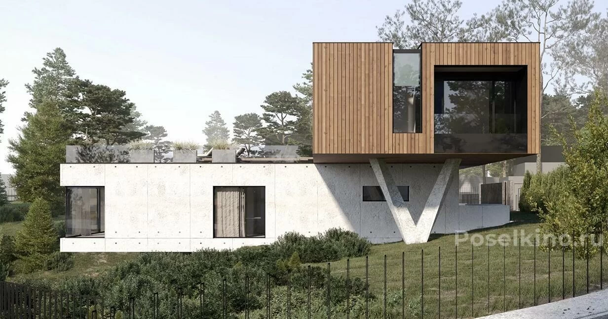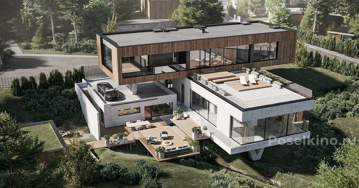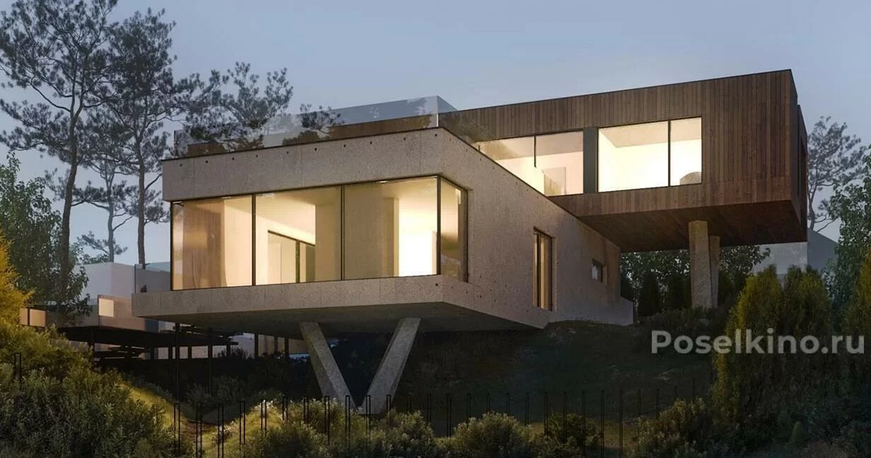 Резиденция Аэро расположена на активном рельефе и будто взлетает над долиной, расправляя секции второго этажа как крылья. Летние пространства дома оснащены системами раздвижного остекления и навесами-трансформерами. Гостиная и кухня соединяются с открытыми зонами, а окна второго этажа заходят на крышу, образуя стеклянный потолок. У подножия парящего дома находится ручей, за которым расположен собственный спа-комплекс.