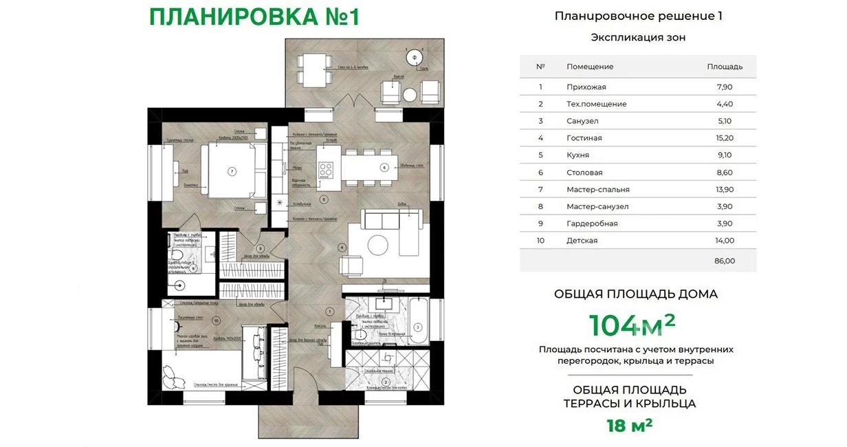 Проект одноэтажного дома из газоблоков с большой кухней-гостинной и террасой. Площадь дома 104 кв.м. Несколько вариантов планировки на выбор заказчика.