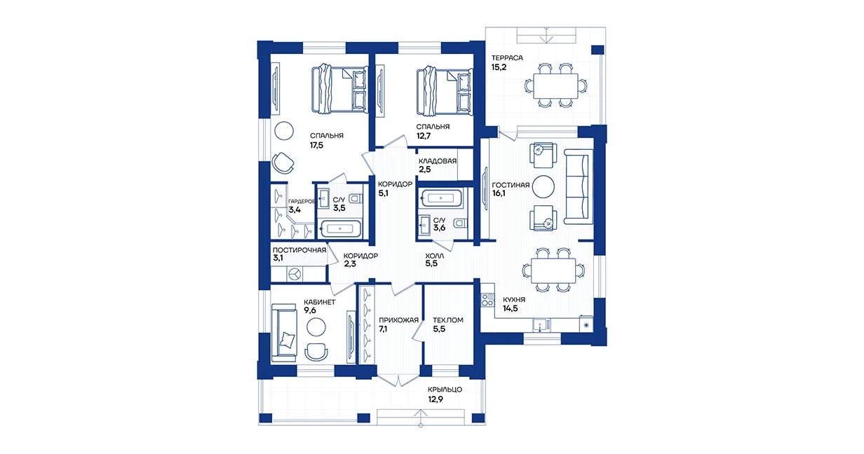 Дом из газобетона в стиле "Райт" площадью 140.1 кв.м (включая террасы, крыльцо и балконы). Особенности планировки: просторная терраса, наличие техпомещений, зонирование площади на спальную и гостевую зоны.