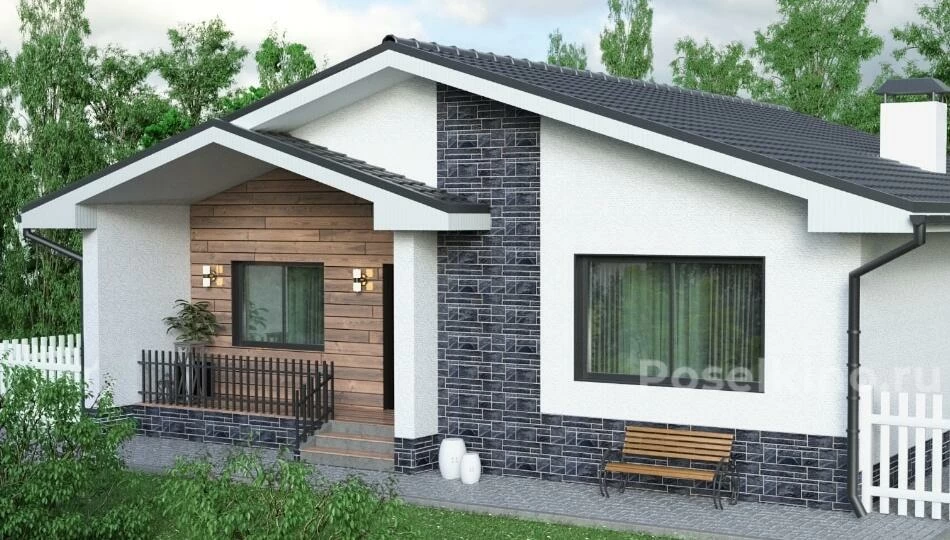Одноэтажный коттедж с тремя спальнями и просторной гостиной-столовой с панорамным остеклением и выходом на террасу. Предусмотрено два санузла (центральная канализация). Дом имеет заасфальтированное парковочное место и участок, огороженный евроштакетником.