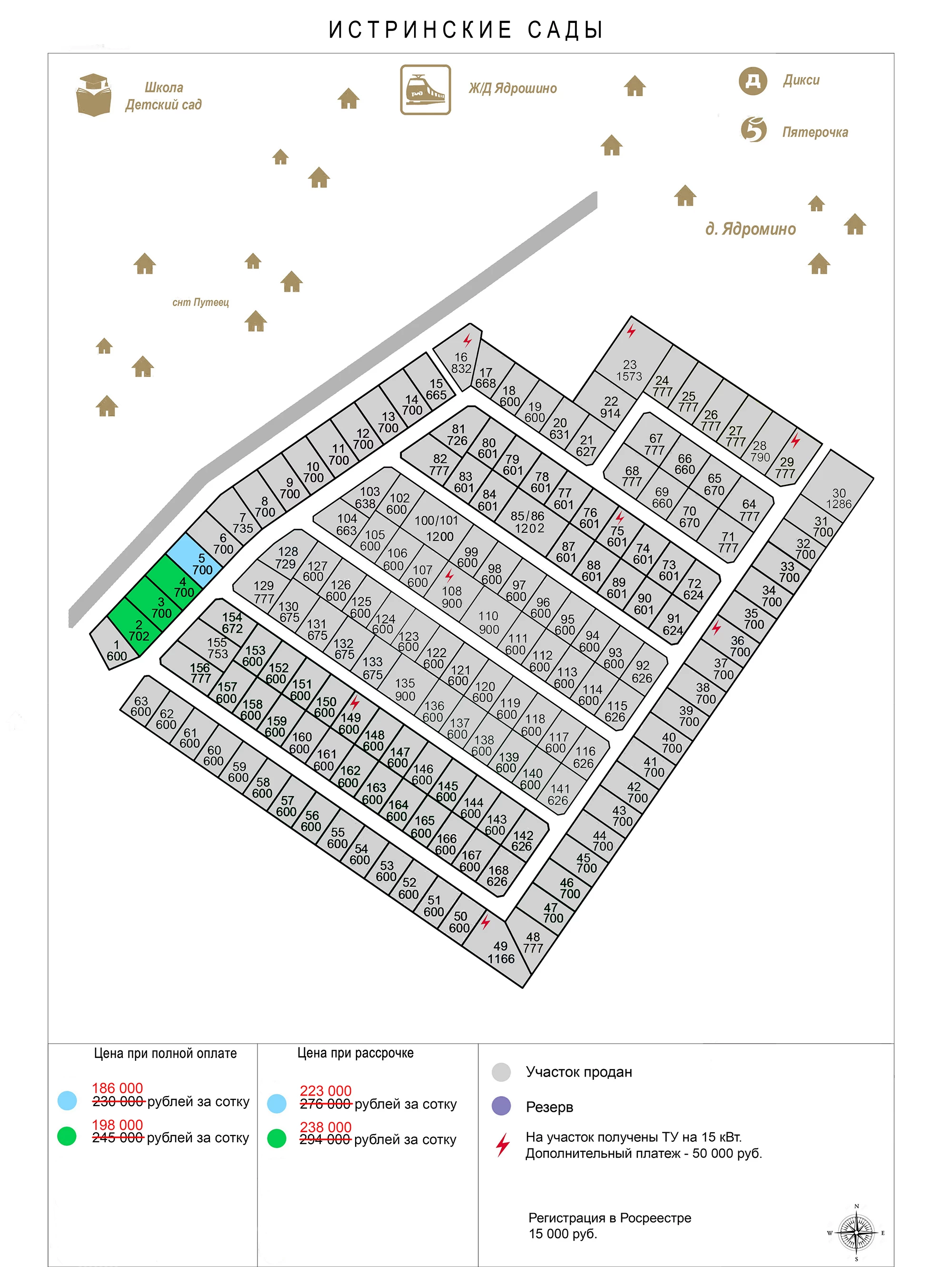 Продается участок № 4 площадью 7 сот. в коттеджном поселке Истринские сады в Истринском районе. В поселке подведено электричество, проложены внутренние проезды, ближайший магазин в 500 м, ж/д станция Ядрошино - в 1,2 км.