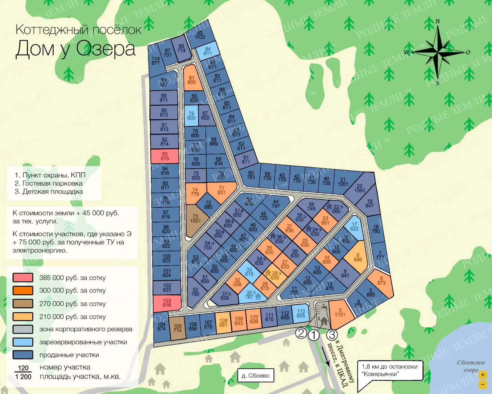 Коттеджный поселок в пешей доступности от Сбоевского озера. Он находится на возвышении, и с участков открываются живописные виды. Пляж на озере, рыбалка, сбор грибов и ягод в огромном лесу, примыкающем к поселку на севере - любимые развлечения местных жителей. В нескольких километрах от поселка ЦКАД и Дмитровское шоссе, так что дорога до столицы займет 45-50 минут. Проект благоустройства предусматривает прокладку внутренних проездов из асфальтовой крошки, электрификацию, установку ограждения, охрану 24/7.
