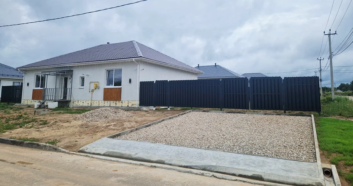 Концепция застройки поселка предполагает одноэтажную застройку одноэтажными домами площадью 100-160 кв.м. Планировки, веранды, цветовые решения заказчик изменяет по своему усмотрению. Для участков устанавливается ограждение в единой стилистике, асфальтируется парковочная зона на два автомобиля.